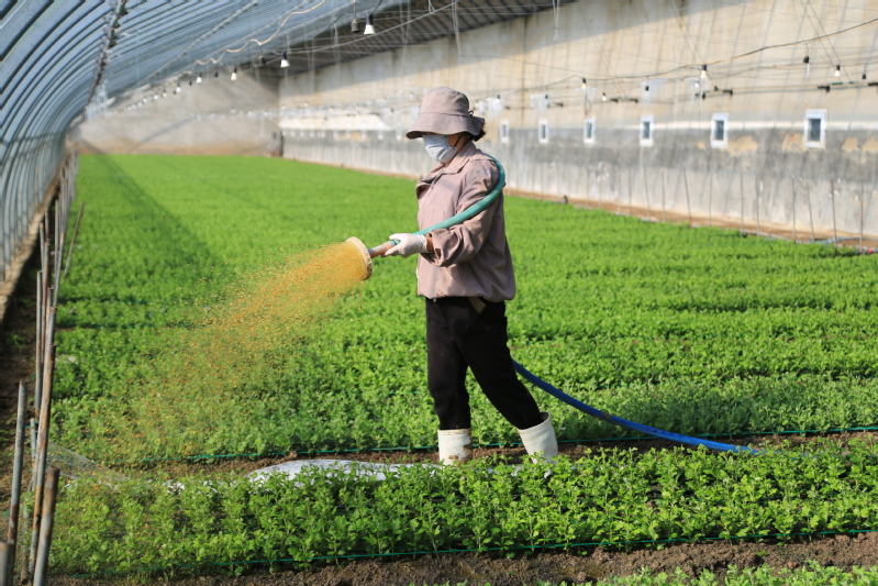 2024年11月26日,江蘇省連云港市海州區(qū)的江蘇農(nóng)墾崗埠農(nóng)場,工作人員在大棚里為菊花苗施撒水溶肥,調(diào)節(jié)土壤酸堿度,活化土壤,促進菊花生根生長。