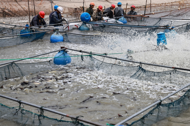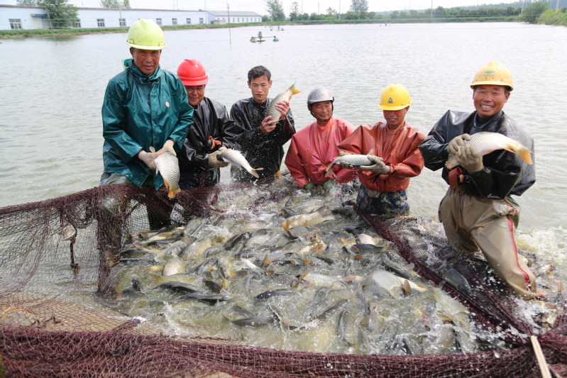 春放秋捕,共話豐收。走進(jìn)崗埠農(nóng)場公司南漁場的鯉魚養(yǎng)殖基地,一條條肥美的鯉魚不斷躍出水面,引起水花四濺。8月29日,崗埠農(nóng)場公司水產(chǎn)養(yǎng)殖中心迎來鯉魚“大豐收”,養(yǎng)殖基地內(nèi)熱鬧開捕秋天第一網(wǎng)鯉魚。初秋的早晨已然涼意十足,早上不到6點(diǎn),天剛蒙蒙亮,捕撈人員就來到魚塘開網(wǎng)起魚。在水產(chǎn)公司工作人員的指揮下,一張巨大的漁網(wǎng)隨著捕魚工人的移動緩緩張開,大家不顧冰冷的水下溫度,緊張忙碌了起來。經(jīng)過鋪底、收網(wǎng)、聚攏等環(huán)節(jié)的共同協(xié)作,漁網(wǎng)被慢慢升起……整個(gè)現(xiàn)場一片繁忙熱鬧景象。經(jīng)過近三個(gè)小時(shí)的忙碌,在大家的精心分揀下,裝滿魚的筐子被吊車有序吊起,稱重、記錄、放魚一氣呵成。“這個(gè)吊車頂部的黃色圓塊就是電子秤,吊起魚的同時(shí),秤上的信號就發(fā)到這個(gè)無線接收裝置上來,秤重既方便又精準(zhǔn)?!爆F(xiàn)場記賬的方正解釋說?!翱催@些魚,品相好、質(zhì)量高,抓都抓不住,活蹦亂跳的,真是大豐收?。 逼痿~的工人們雖然全身都已濕透,但是看著手里的大魚,臉上洋溢著收獲的笑容。據(jù)悉,本次捕撈的鯉魚名叫“福安鯉”,在春季投放,采取訂單式捕撈銷售。當(dāng)天,2.2萬斤“淮河牌”福安鯉被送上等候已久的運(yùn)輸車,銷往本省徐州市及河南省等地?!梆B(yǎng)殖中心依托豐富水