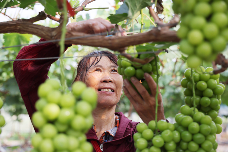 云臺農(nóng)場公司依托良好區(qū)域生態(tài)優(yōu)勢,積極發(fā)展生態(tài)休閑農(nóng)業(yè),促進(jìn)農(nóng)旅融合發(fā)展。圖為8月19日,職工在云水灣濕地公園采摘葡萄。據(jù)悉,該場栽植鋼架大棚葡萄55畝,畝產(chǎn)最高達(dá)2700斤。