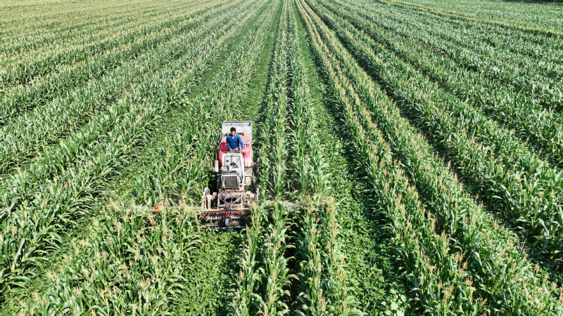 玉米雄穗剛露頭尚未開花散粉時(shí)進(jìn)行去頂(去掉玉米雄穗),既能讓玉米提前成熟3-5天,又可以使玉米籽粒灌漿相對集中、減少養(yǎng)分消耗,可以降低株高防風(fēng)防倒,改善玉米基部及行間大豆光照積累,減少穗部易患玉米螟、蚜蟲等害蟲的危害,從而達(dá)到增產(chǎn)的目的。蘇墾農(nóng)發(fā)淮海分公司通過引進(jìn)2臺玉米切頂機(jī),對5000多畝玉米大豆帶狀復(fù)合種植田間的玉米雄穗進(jìn)行切頂作業(yè),據(jù)悉,每臺機(jī)械每天可以作業(yè)200畝,極大地提升了工作效率。圖為8月16日,淮海分公司運(yùn)用大機(jī)械在玉米大豆帶狀復(fù)合種植田間對玉米雄穗進(jìn)行切頂作業(yè)。